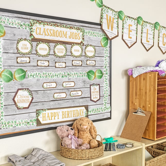 Accentuate your classroom with this Eucalyptus themes accents kit. The leafy design with wooden and muted gold accents creates a calming environment for your kids to learn and thrive.Kit includes 273 total pieces:1 Believe in Yourself Banner30 Positive Saying Accents4" ...