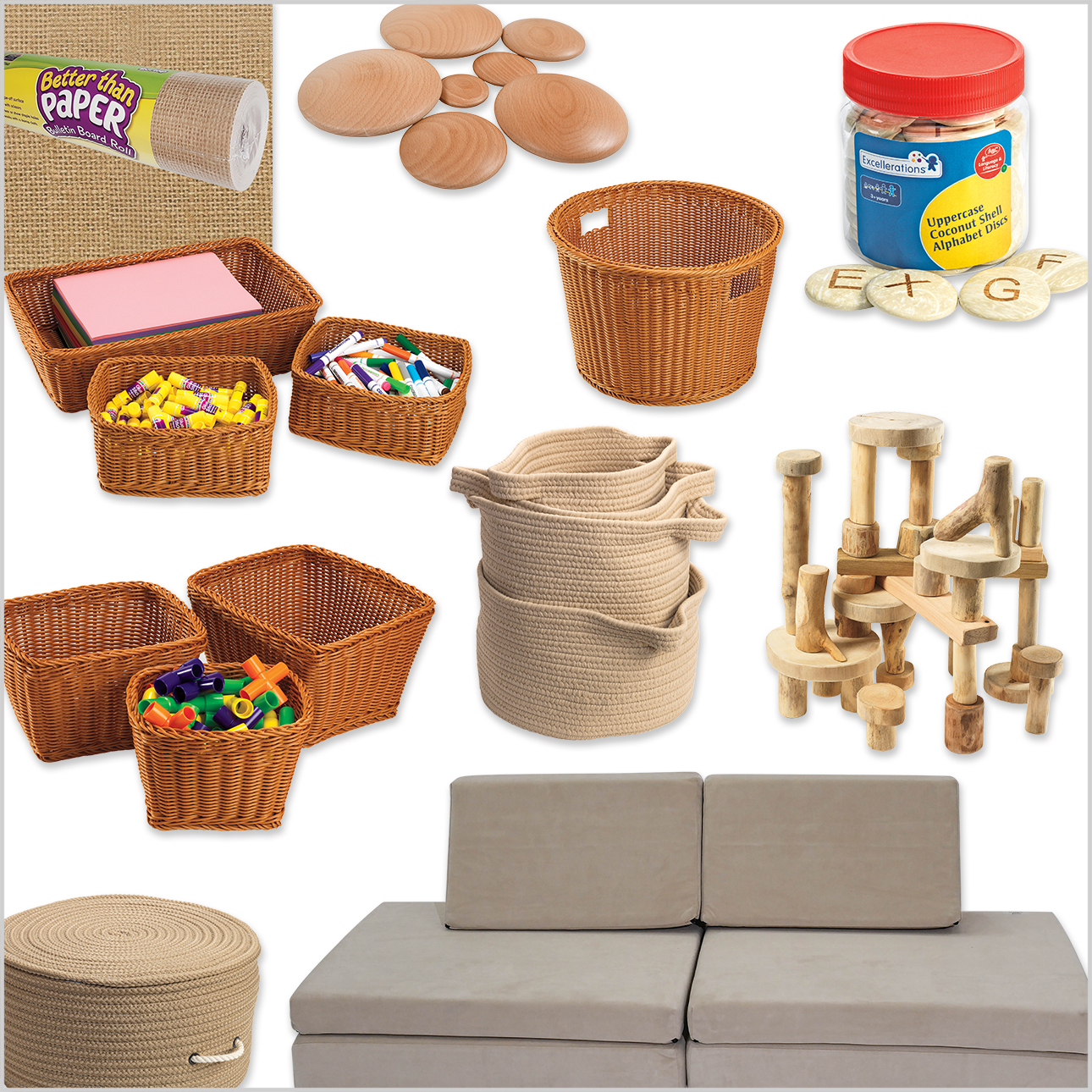 Excellerations® tactile natural coconut shell uppercase alphabet discs, an American farmhouse 4-piece basket set in wheat, 1 washable round basket, a washable tray and storage baskets, a set of 3 wicker-look plastic trays, a simply home solid pouf in cafe tostado, 1 better than paper bulletin board roll, 36 pieces of tree blocks without bark, 7 natural buttons wooden disks, and one whatsit modular sofa in taupe