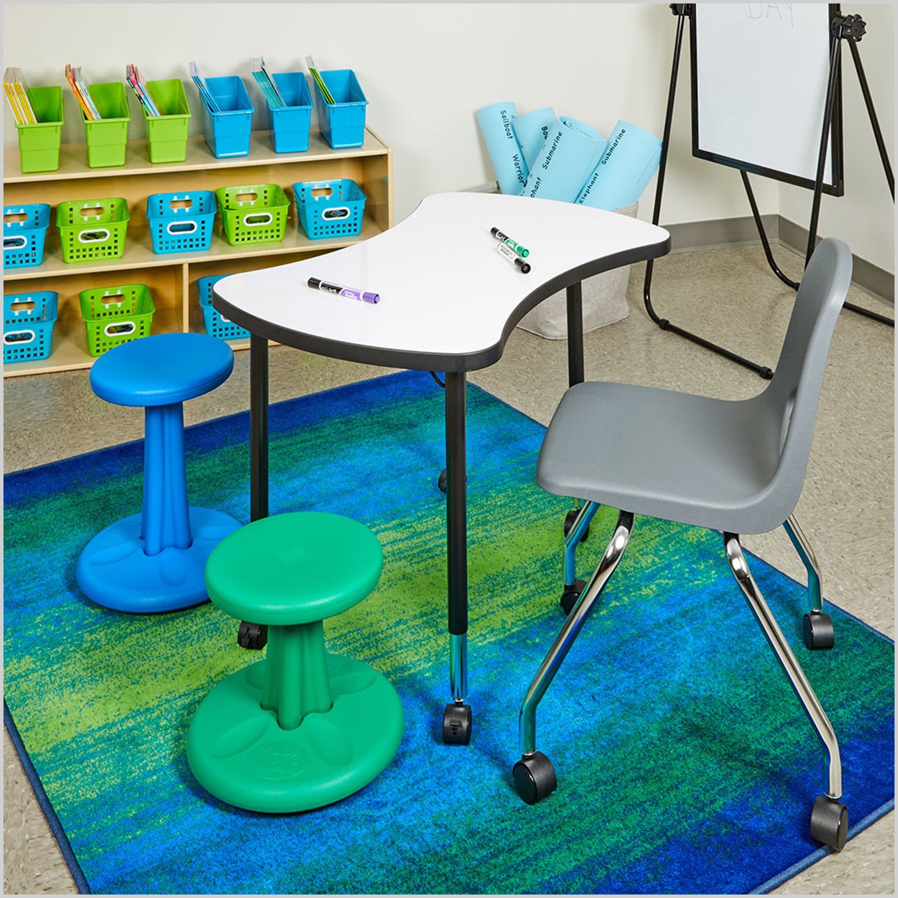 Bundle includes: one bowtie dry erase activity table, one 2-pack 18" mobile chair with casters in gray, one kore wobble stool in green, one kore wobble stool in blue, one portable magnetic dry erase easel, one set of 3 Inspire U Posters, three book and binder holders in neon green, three book and binder holders in neon blue, one MyPerfectClassroom® mobile double-sided storage with casters, one harmony blend small rectangle carpet, four medium book baskets in neon green, one better than paper bulletin board roll in blue, one 4' x 6' value-tak cork board with aluminum trim, and five medium book baskets in neon blue.