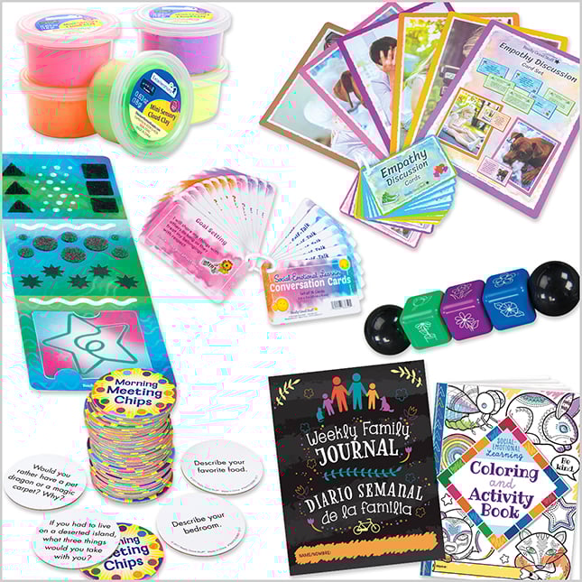 Morning Meeting Chips - 40 chips, Bilingual Weekly Family Journals-12 pack, SEL Coloring Book 12 Pack, Social-Emotional Learning Conversation Cards, Empathy Discussion Card Set, Sensory Desktop Helpers-12pk, Fidget Twists 10 Pack, Excellerations® Mini Sensory Cloud Clay Set of 5
