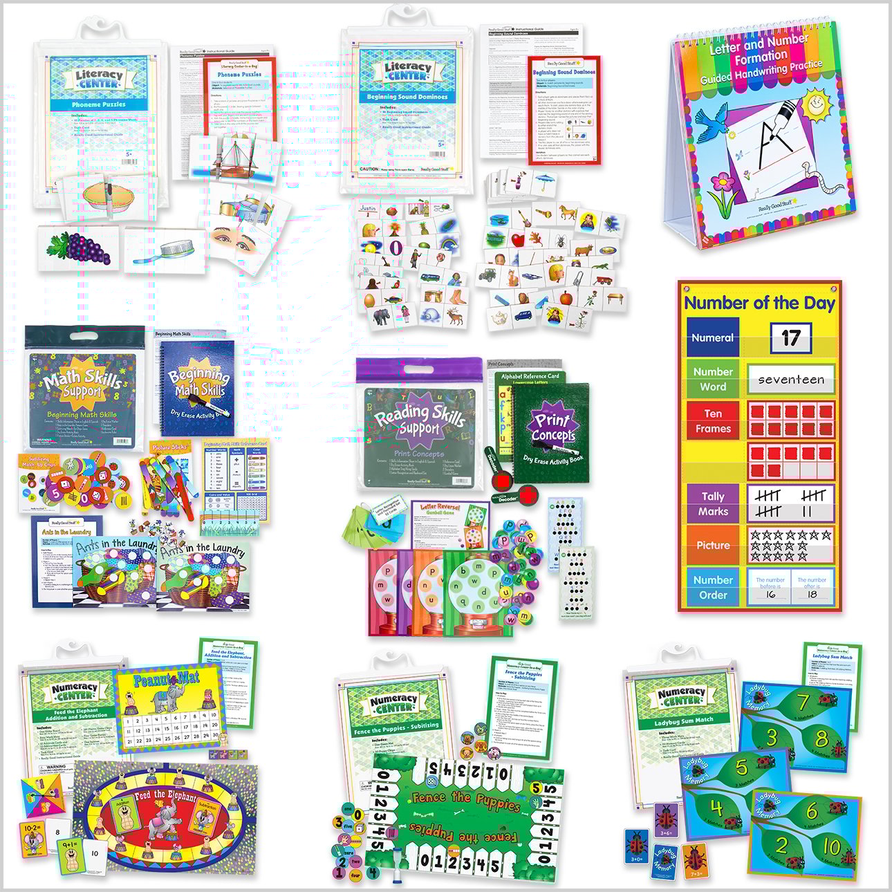 Feed the elephant addition and subtraction, ladybug sum match, fence the puppies – subitizing, beginning sound dominoes, phoneme puzzles, Math Skills: grade Pre-K - beginning math, Reading Skills: grade Pre-K - print concepts, 1 letter and number formation flip chart, and a number of the day space saver pocket chart