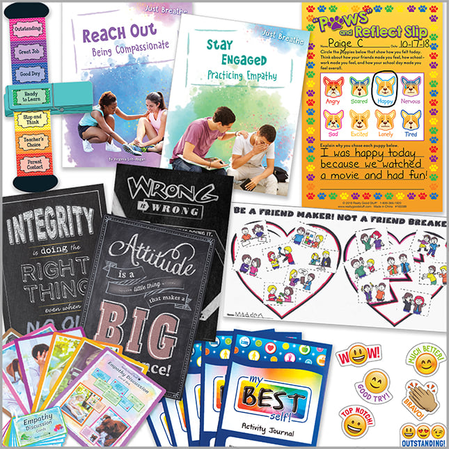 Mini Behavior Trackers - 12 trackers, Reach Out: Being Compassionate, Stay Engaged: Practicing Empathy, Empathy Discussion Card Set, 'Paws' And Reflect! Slip - 500 slips, Inspire U Poster - Integrity - 1 poster, Inspire U Posters - Wrong Is Wrong Even If... - 1 poster, Inspire U Posters - Attitude Is A Little Thing... - 1 poster, My Best Self Mini Activity Journals - 36 journals, and Emoji Rewards Stickers - 75 stickers