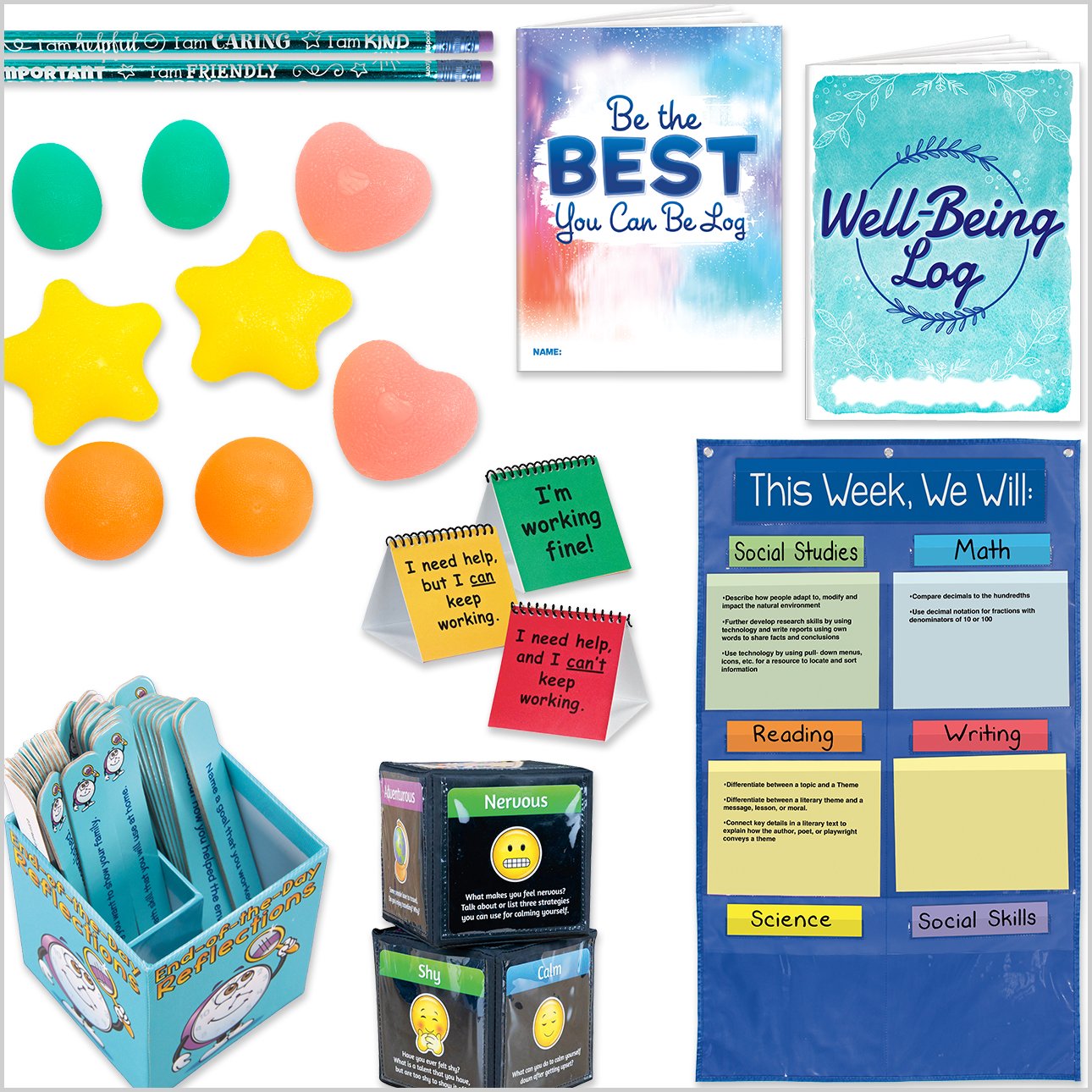 Bundle includes: Well-Being Logs, Emoji Feelings Cards And Cubes, Be The Best You Can Be Log, Excellerations® Sensory Stress Balls - 2 Sets of 4, Positive Affirmation Pencils, I Need Help Mini Flip Chart, End Of The Day Reflections Cup, Learning Goals Pocket Chart