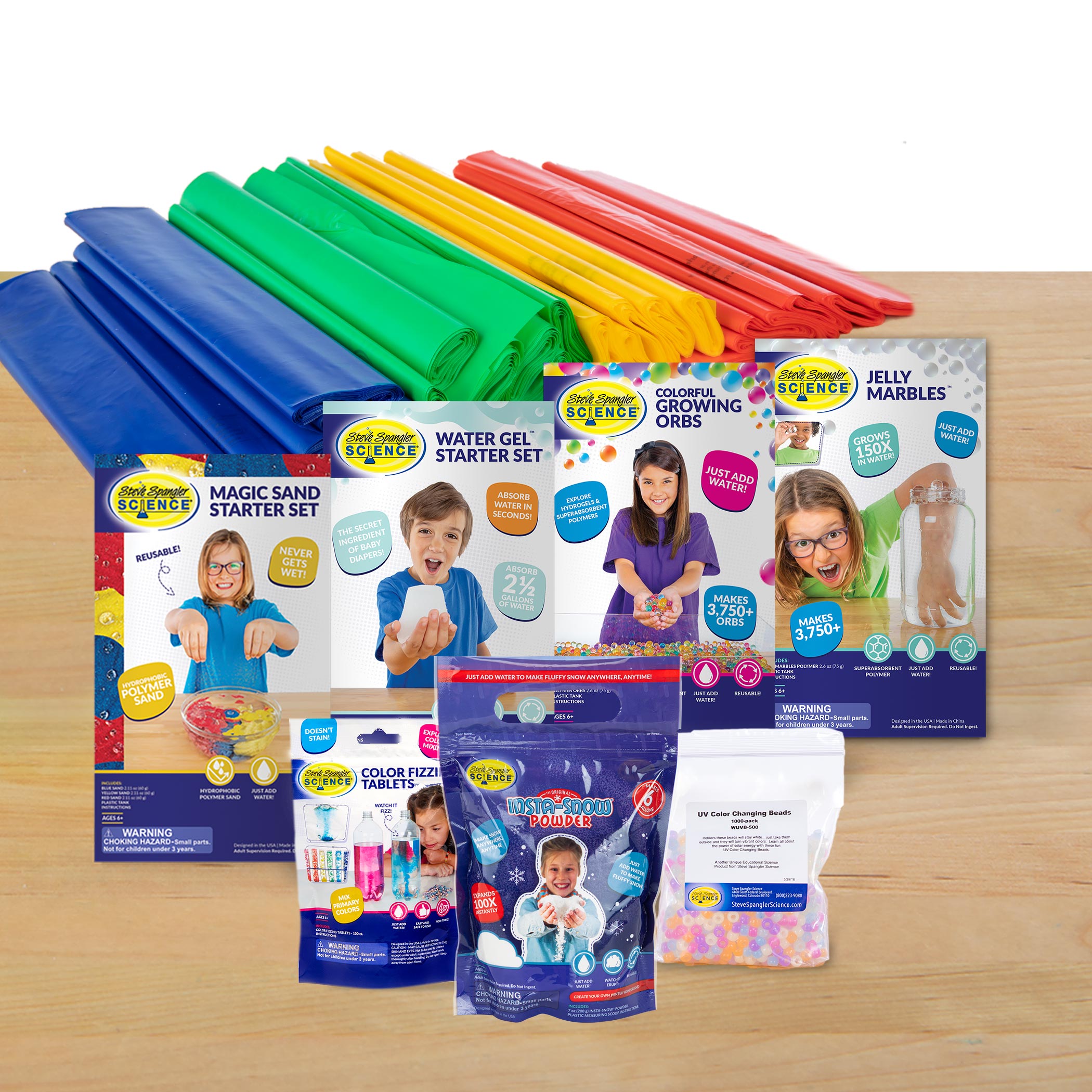 UV color changing beads with assorted colors, a Water Gel™ starter set, a Jelly Marbles™ starter set, a colorful growing orbs starter set, a magic sand starter set, a package of 32 WINDBAGS, 6 gallons of The Original Insta-Snow® Powder, and color fizzers