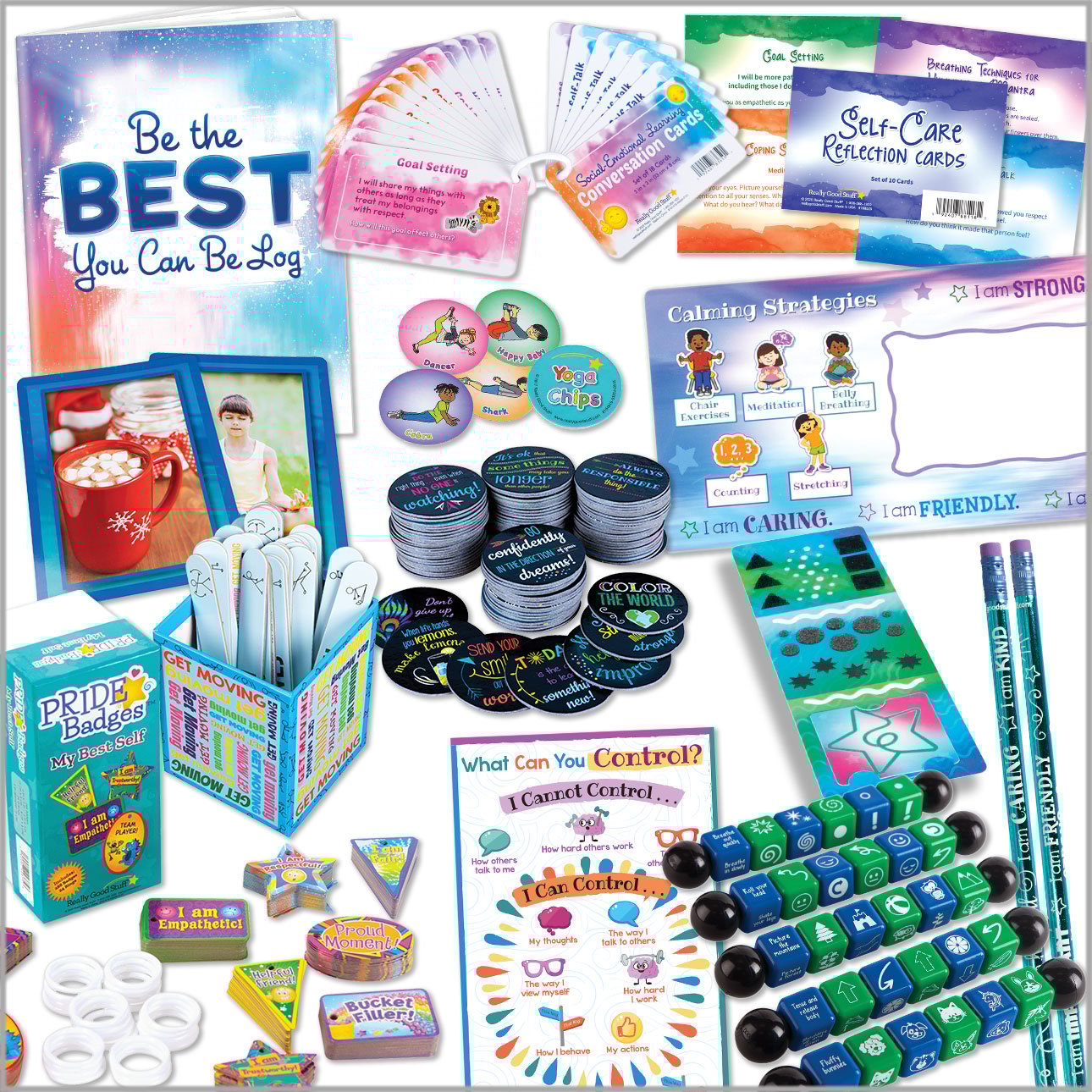 Be The Best You Can Be Logs - 12 journals Help Students Track Their Personal Growth With Inspiring Journals; Pride Badges My Best Self 288 die cut badges and 24 plastic rings; Social-Emotional Learning Conversation Cards 18 double-sided cards Size: 3" by 5" each; Calming Twists 5 twists, each with 6 unique 6-sided cubes - 1" x 1" x 1", Size: 8" long x 1" wide; Sensory Desktop Helpers Set Of 12 Size: 4" by 12" each, with 3" by 3" removable card; Self Care Reflection Cards Set of 10 double sided cards - 4" x 6" plus cover card; Social-Emotional Learning Self-Adhesive Deluxe Plastic Desktop Helpers 24 plastic, self-adhesive Helpers, Size: 18" by 5" each; Positive Affirmation Chips - Set of 100 in 50 Unique Designs and Sayings; Take A Mindful Minute Photo Cards - 11 cards Teach Students Mindfulness Techniques With These Intriguing Photo Cards!; Yoga Chips - 24 chips Rejuvenate Students With Classroom Yoga;Get Moving Sticks - 36 sticks Kids pull a stick from the box and get moving! Breaks the day up with little interludes of exercise.; Classroom Expectations And Behaviors Poster Set 6 posters, Write Again wipe-off laminate, with reproducibles on back, Size: 19" by 12" each.