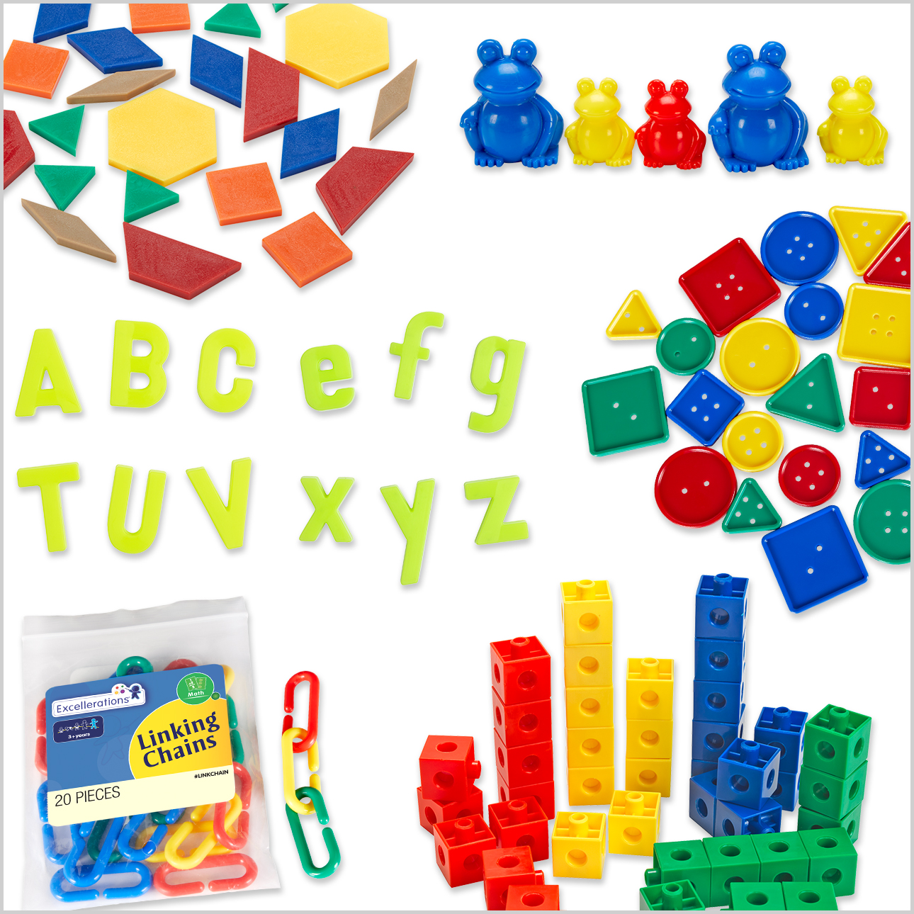 Bundle includes: one set of 40-piece Excellerations® connecting cubes, one set of 24-piece Excellerations® pattern blocks, one set of 24-piece Excellerations® attribute buttons, one set of 20-piece Excellerations® linking chains, one set of 27-piece Excellerations® frog counters, one set of 26-piece Excellerations® uppercase plastic letters, and one set of 26-piece Excellerations® lowercase plastic letters.