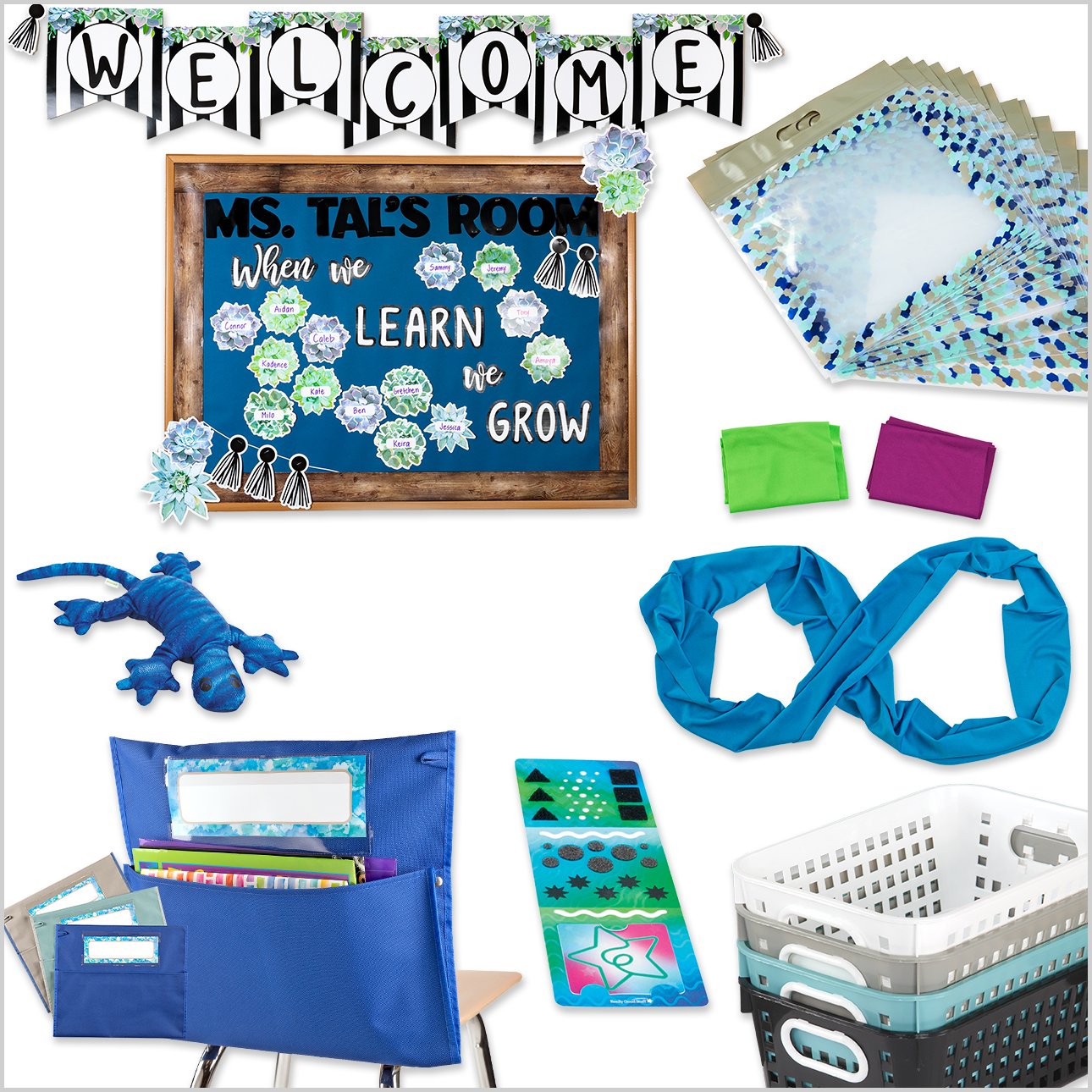 Bundle includes: Stylish Classroom Décor collection, Simply Stylish Calendar Set, Stylish B-Day Bulletin Board Set, Chair Pockets-Cool&Calm, Cool And Calm Storage Bags, Cool & Calm Med Book Pouch, Better Than Paper-Blue, Book Baskets Med Rect Neutral, Book Baskets Lg Rect Neutral, Mindfulness Bookset Grades 4-8, Weighted Blue Lizard, Sen Infinity Loop-36"-6Pk, Sensory Desktop Helpers, Fidget Twists, Honeycomb Rug - 6'X9' Rect