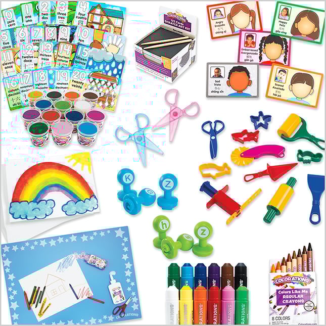 Bundle Includes: Colorations® Dough and Numbers Modeling Mats, Colorations® Emotions Mats and Dough, Colorations® Tempera Paint Sticks, Colorations® Ultimate Art Paper, Colorations® Keep-It-Clean Plastic Art Mats, Colorations® Plastic "Won't Cut Hair" Scissors, Colorations® Dough Tools Starter Set, Colorations® Alphabet Dough Stampers - Upper, Colorations® Alphabet Dough Stampers - Lower, Colorations® Scratch Art Kit, Colorations® Colors Like Me Crayons