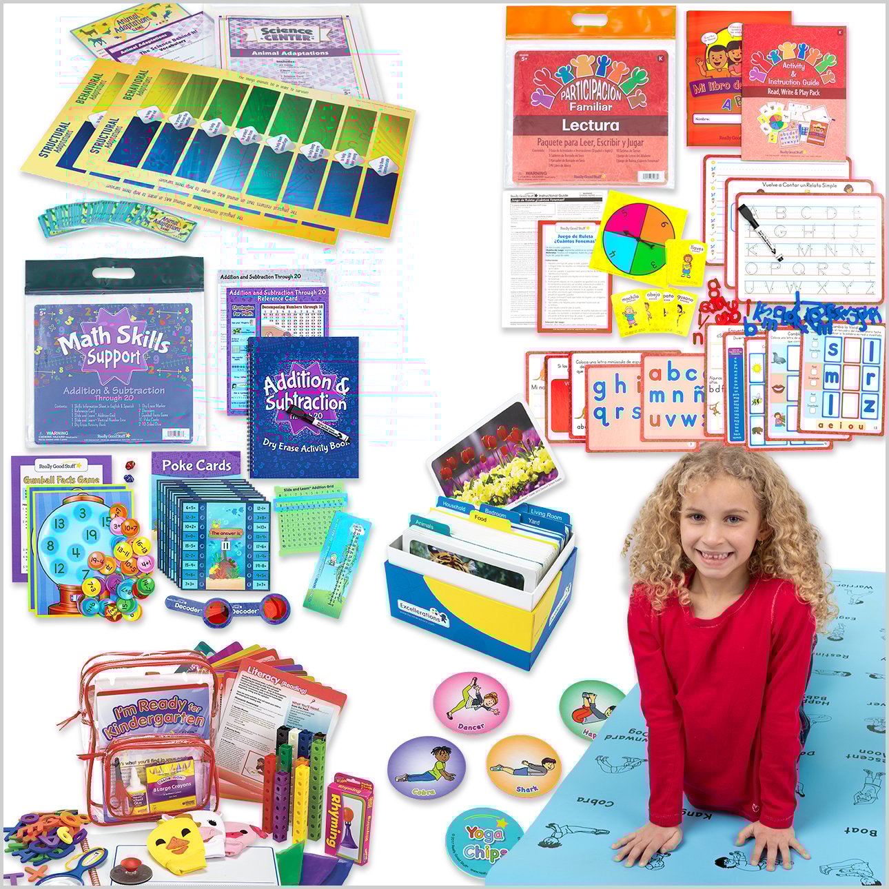 Bundle Includes: Excellerations Kindergarten Readiness Kit, Learning Success Kit: Pre-K, Learning Success Kit: Kindergarten, Learning Success Kit: 1st grade, Learning Success Kit: 2nd Grade, Learning Success Kit: 3rd Grade, Learning Success Kit: 4th Grade, Learning Success Kit: 5th Grade, Learning Success Kit: Upper Grades, Spanish Family Engagement Reading: Kindergarten, Family Engagement Reading: Pre-K, Family Engagement Reading: Upper Grades, Family Engagement Math: 1st Grade, Family Engagement Math: 4th Grade, ELA Skills Support: Phonemic Awareness, Math Skills Support: Add + Subtract, Fraction Face-off Numeracy Center, Feed the Elephant Numeracy Center, Weather Science Center, Animal Adaptations Science Center, Excellerations Familiar Object Language Card, SEL Inspirational Motivating and Self Care Messages, Mindfulness for Adults, Pride Badges My Best Self, Children's Yoga Mat, Take A Mindful Minute Photo Cards, Guided Meditation for Kids Flip Chart, Yoga Chips, Noise Muting Headphones, Sensory Desktop Helpers, Excellerations® Liquid Tile Shapes, Light Up Construction Bricks