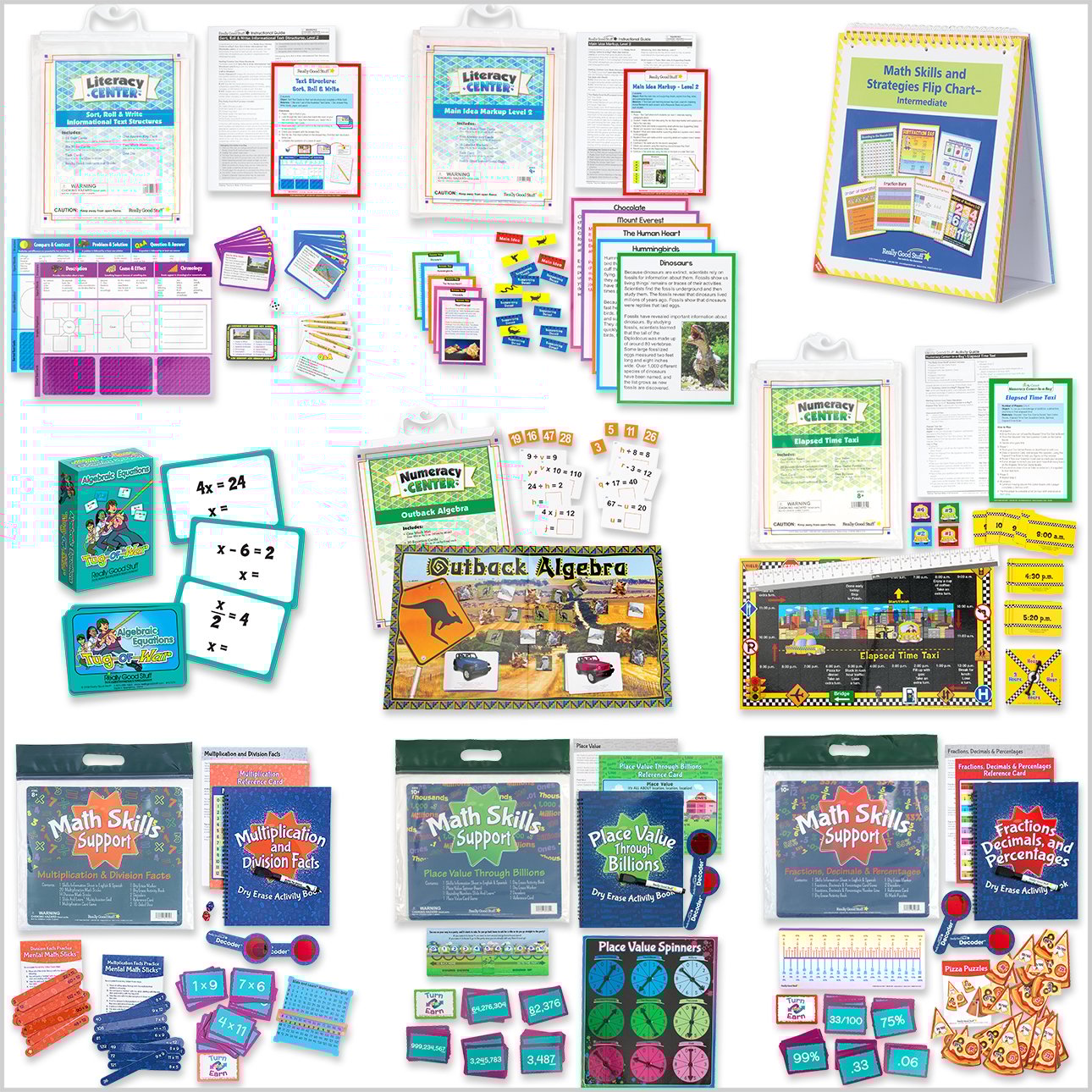 An outback algebra Numeracy Center, an elapsed time Numeracy Center, a main idea markup Literacy Center, a text structures Literacy Center, a Math Skills: multiplication and division, a Math Skills: place value, a Math Skills: decimals, fractions, and percentages, an intermediate Math Skills flip chart, and a tug of war for algebraic equations