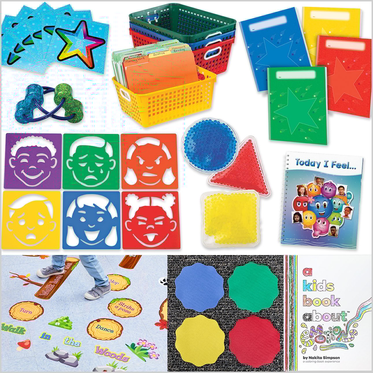 Help your students regulate their emotions and feelings by creating zones for each. The blue zone will help provide resources for those students who are feeling sad, bored, tired or just not themselves. The green zone will give students opportunities to express their happiness, focus in on their goals and calmly reflect on the things their proud of. The yellow zone will be a place to get out the sillies, express something they're worried about or maybe something that's frustrating them. Lastly, the red zone will be a place for the high impact emotions such as anger, stress, or over-excitement. Students will have resources to journal about their feelings, color, play with fidgets or take some deep breaths with our breathing star to help them identify the emotions they are feeling and center back on the present in a calm, relaxing way. Bundle includes: *4 Color Carpet Mark-Its *4 Color Journals *4 Color Large Baskets *6 Emotion Stencils *2 Feelings Flip Books *A Kids Book About Emotions *EZ Stick A Walk in the Woods Sensory Path *6 Breathing Tactile Stars *3 Gel Bead Sensory Shapes *Loopeez Fidget Toy