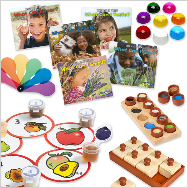 This is a five-book series, named Acorn: These Are My Senses. Each book in this series takes a very simple look at a different sense: taste, sight, hearing, touch, or smell. Leveled text with repeated use of high frequency words makes the books perfect for beginning readers, while bright, colorful photographs complement the text and maintain readers' interest.