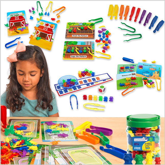 - COMPLETE EARLY MATH KIT: Preschoolers will love exploring early math concepts with these popular and versatile components! Included: 72 counting bears (12 each of 6 colors - red, orange, yellow, green, blue, purple - all 1-1/2 inches), 6 corresponding sturdy bowls with handles, 6 tweezers, 1 foam die, and 6 patterning cards.