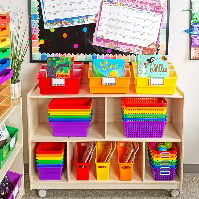 - AVAILABLE IN FUN COLORS: The 6-bin assorted set includes one (1) book bin in each color: red, orange, yellow, green, blue and purple. Also available in other multicolor and single-color four-packs, and single-color 12-packs.