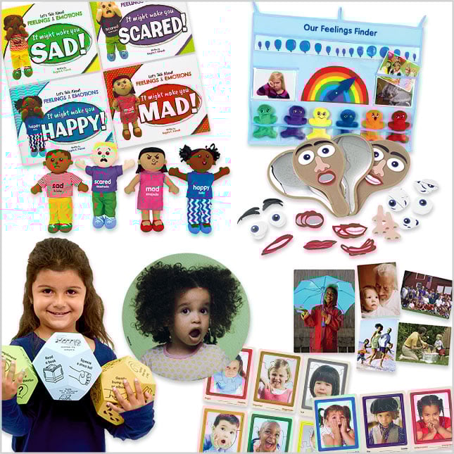 This SEL Mega kit includes 8 large plush dolls, 8 sixteen-page books, and 32 double-sided blocks. Each doll in this set of 8 expresses an emotion on its face: sadness, fear, anger, happiness, shyness, peacefulness, surprise and disgust. With the ...