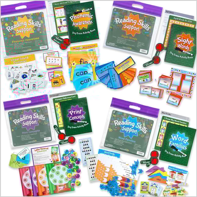 These three sets of self-checking dry erase cards actively involve students in substituting phonemes to make new words. With CVC cards, players change one letter at a time in four steps to turn, for example, pig into dog. The long ...