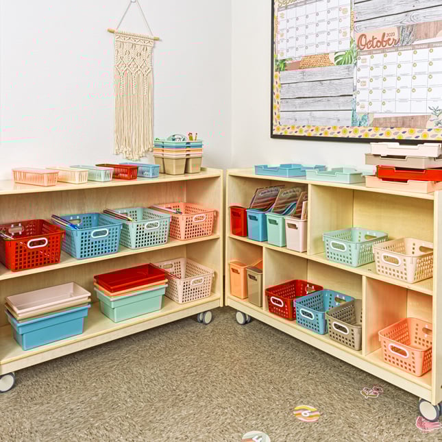 This sturdy, medium-sized storage rack is the perfect solution for classrooms that are short on space for creating an accessible library. It easily rolls anywhere on four locking casters and holds picture book bins in four bright colors, ideal for ...