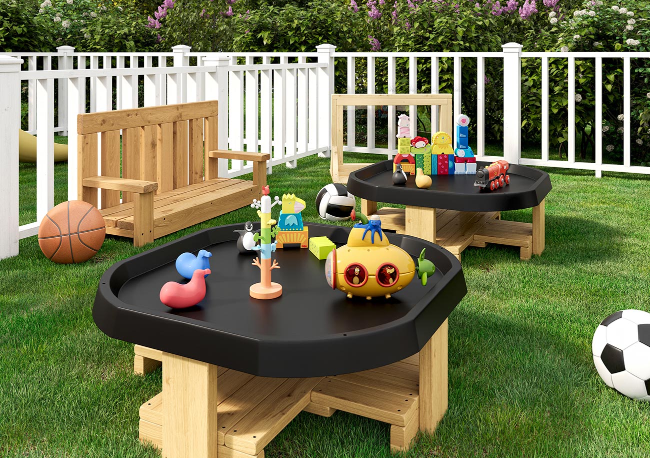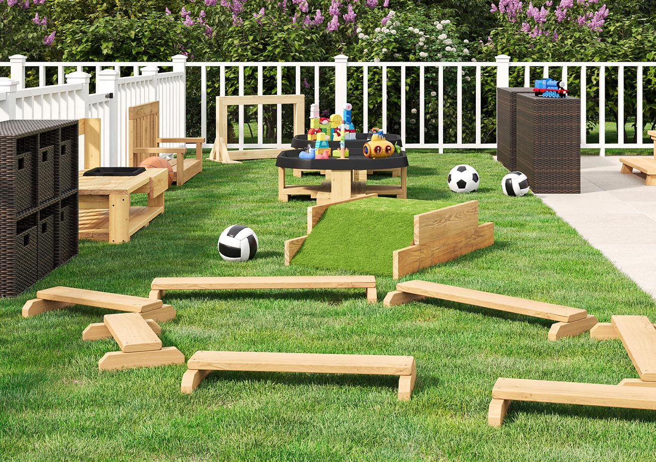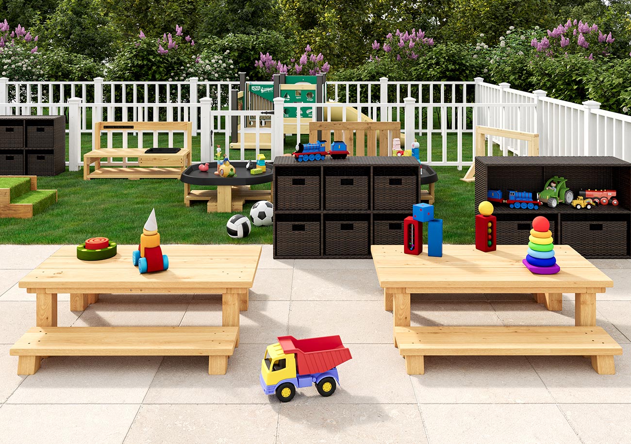 Create an encouraging setting for crawling, climbing and exploration. We've designed this outdoor environment with durable wicker furniture and exciting activities for developing motor skills.